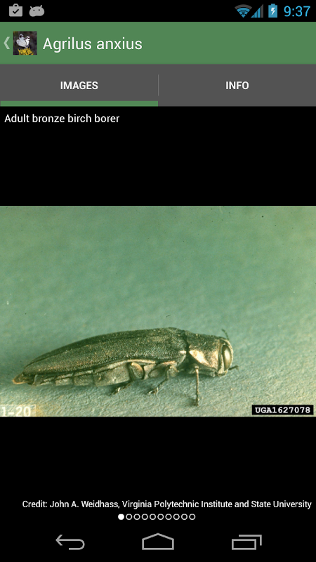 Le foto presenti in questa applicazione hanno lo scopo di aiutare i forestali, i dipendenti del paesaggio urbano, o altri che lavorano con gli alberi di riconoscere alcuni degli insetti parassiti comuni che colpiscono gli alberi in Nord America e capire i loro cicli di vita e come si danneggiano gli alberi. Le informazioni sono state tratte da libri, siti web, schede informative, e una certa letteratura originale. Questa App non è una guida per gli specialisti. In molti gruppi, come i scolitidi e afidi, la conferma dell'identità specie richiede attenzione ai dettagli non visibili in foto con confronti con altre specie e l'uso di chiavi simili. Fonti per ulteriori informazioni (siti web e articoli) sono riportati nella parte inferiore della pagina di ciascuna specie.