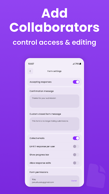 Hai bisogno di un modulo subito? Crea moduli velocemente con questa app per la creazione di moduli e sondaggi: inizia con un modello o usa l'intelligenza artificiale, quindi condividi tramite link o QR code. Visualizza i grafici a colpo d'occhio ed esportali su Fogli Google con un solo tocco. Gestisci il tuo flusso di lavoro di Google Moduli interamente da dispositivo mobile, senza bisogno di un browser.