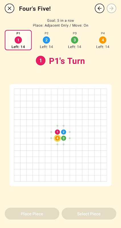 "Four's Five!" è un gioco di Gomoku (cinque di fila) che può essere giocato da un massimo di 4 persone.