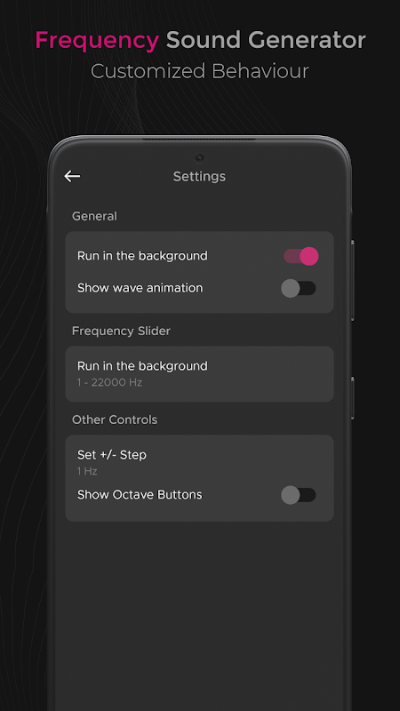 Generatore di suoni di frequenza è un generatore di onde sonore e un oscillatore di frequenza facile e semplice da usare. Consente di generare un'onda sonora sinusoidale, quadrata oa dente di sega e triangolare con frequenza compresa tra 1Hz e 22000 Hz (hertz). È inoltre possibile impostare la frequenza desiderata premendo i pulsanti +/- "Step".