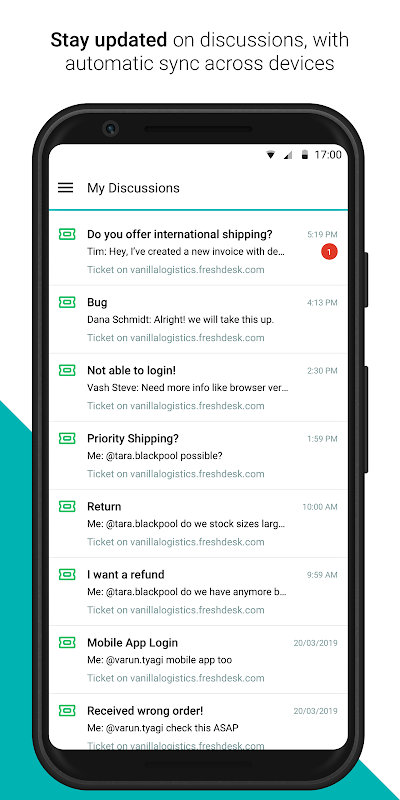 - Collabora con il tuo team sui biglietti Freshdesk per risolvere più rapidamente i problemi dei clienti! Scorri verso sinistra per accedere al contesto del ticket e collabora dove si verifica il tuo lavoro.