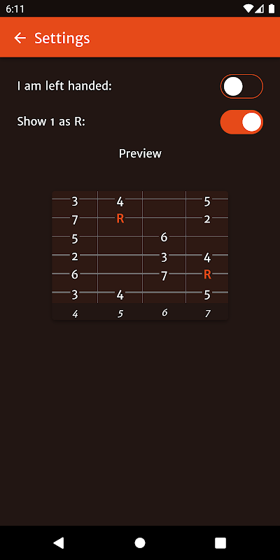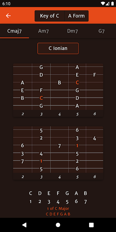 L'applicazione utilizza le posizioni del sistema CAGED. Quindi per tutti i gruppi di modalità / pentatonici / arpeggio avrai cinque posizioni per esercitarti.