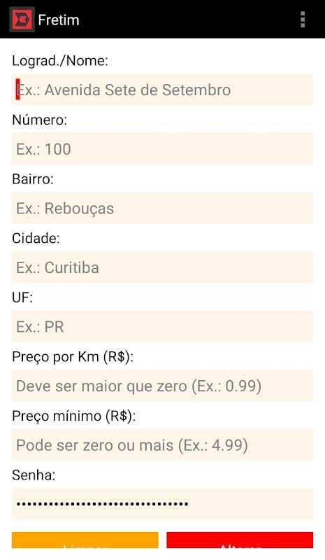 a) Il primo è per chilometro percorso. Es.: lasciare il campo “Prezzo minimo (R$)” con un valore 0 (zero) e un valore per il chilometro percorso nel campo “Prezzo per km (R$)”.