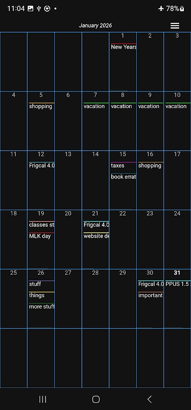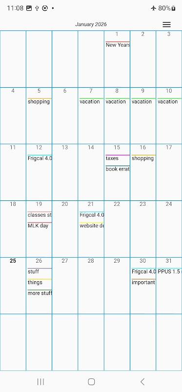 Frigcal è un'app gratuita e senza pubblicità che può essere utilizzata come calendario di base o diario basato sulle date sia su telefoni e tablet Android che su PC Windows, macOS e Linux. Presenta tre qualità che la distinguono da altri programmi di calendario: