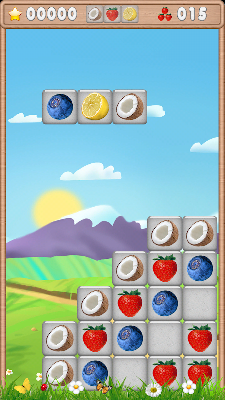 Raccogliere in una linea di 3 o più frutti uguali per cancellarlo.