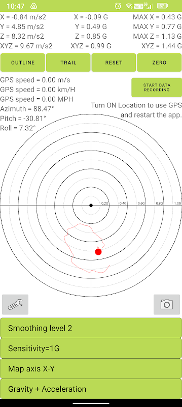 2. Registrazione dati: G-Meter registra i tuoi valori di accelerazione in tempo reale, permettendoti di rivedere e analizzare i tuoi dati in un secondo momento.
