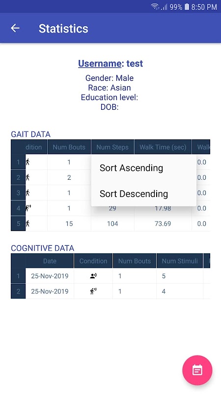 * Disponibili opzioni cognitive e andatura per attività singole e doppie. Il test cognitivo è attualmente uditivo di Stroop, con gli utenti che chiedono di rispondere al tono della parola, piuttosto che alla parola pronunciata. I parametri di esito includono tempo di reazione e precisione. Presto saranno disponibili anche altri compiti cognitivi.