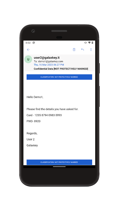 Quando qualcuno ti invia Galaxkey il file protetto con l'estensione. Gxk o si invia una e-mail protetto Galaxkey, l'app Galaxkey fornisce un semplice strumento di gestione dei file per aprire i file protetti Galaxkey. Un utente può aprire un file gxk. In app Galaxkey da e-mail o qualsiasi archiviazione di file sul dispositivo mobile. L'applicazione autentica l'utente con il servizio cloud e poi decifra e visualizza i contenuti del file.If il contenuto del file Galaxkey sono una e-mail, quindi l'App Galaxkey visualizzerà l'email con gli allegati. L'applicazione non memorizza tutte le informazioni del file decodificato sul dispositivo in modo i dati è ancora assicurata.