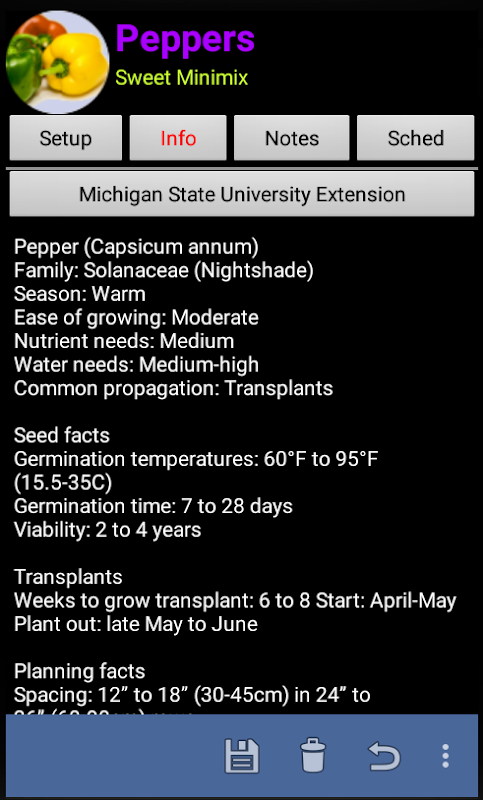 ✔ Useful crop information from multiple selectable sources including VeggieHarvest; (http://www.veggieharvest.com/), Southern Exposure, and a couple University Extensions.