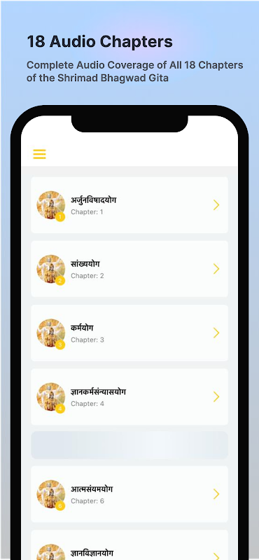 🎧 Copertura audio completa: immergiti in tutti i 18 capitoli della Shrimad Bhagwad Gita attraverso la nostra raccolta audio completa. Ogni capitolo prende vita, fornendoti una comprensione immersiva dei suoi profondi insegnamenti.