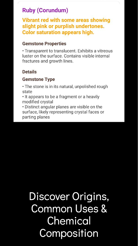 Usa la tua fotocamera o la tua galleria fotografica per identificare un'ampia gamma di gemme per colore, lucentezza, forma e chiarezza.