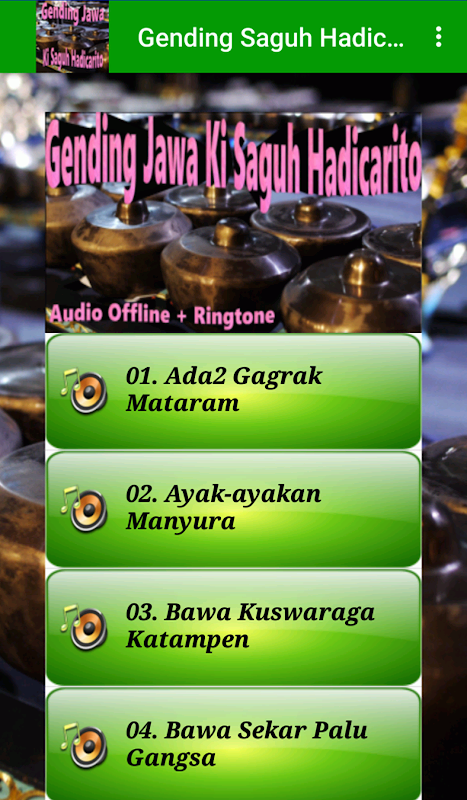 Viene presentata l'applicazione Javanese Gending Song Saguh Hadicarito che contiene le migliori opere del famoso artista giavanese Ki Saguh Hadicarito come Ada2 Gagrak Mataram Mlebet Ayak-an Continua Srepeg Dados Palaran Sekar Pangkur Sl.9< Gending Jineman Gatik Glinding Slendro 9, Palaran Gambuh Serat Wulangreh Pl.Br, Palaran Maskumambang Bharatayuda Pl.6, ecc.