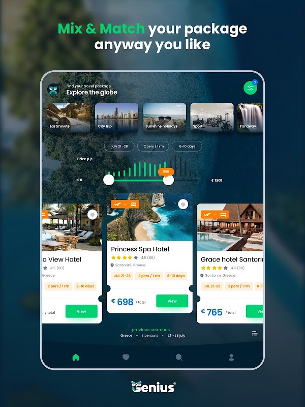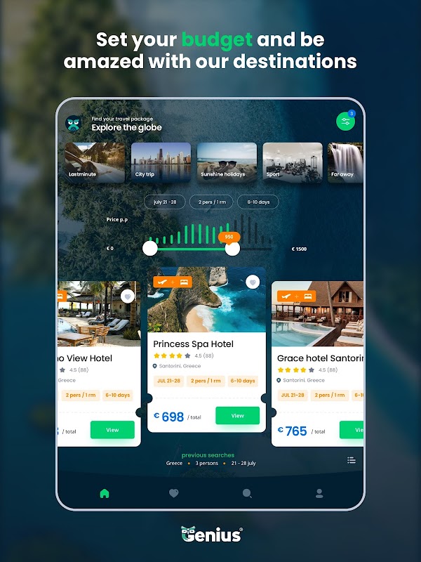 Genius® è la nuova app di viaggio che ti apre il mondo intero in pochi secondi. Con questa app puoi trasformare qualsiasi destinazione in un pacchetto di viaggio economico, comprensivo di volo e hotel. Non hai idea di dove vuoi andare? Nessun problema! Basta inserire il tuo budget e l'app farà il resto e ti sorprenderà con destinazioni a cui probabilmente non avevi nemmeno pensato! Il prezzo indicato comprende sempre hotel e volo per l'intero periodo!