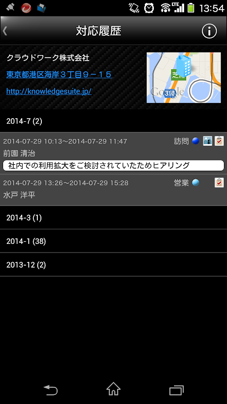 Una volta a capire la posizione corrente utilizzando il GPS, un elenco di clienti che si trovano nelle vicinanze viene visualizzato con una semplice pressione sullo schermo. Questo "servizio di portineria" guida ai vostri clienti e consente di utilizzare il vostro tempo libero in modo produttivo. C'è anche una funzione per condividere registrazioni delle visite precedenti, che consente di sfruttare al massimo le opportunità di business.