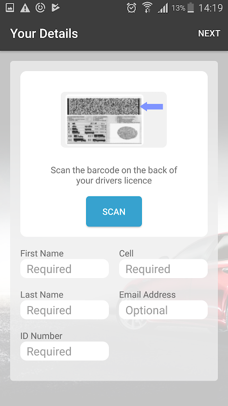 By entering a one time pin, the user is prompted to scan their drivers license and car license, as well as to enter information and take photos. All of this is then submitted and used by our system to value the vehicle.