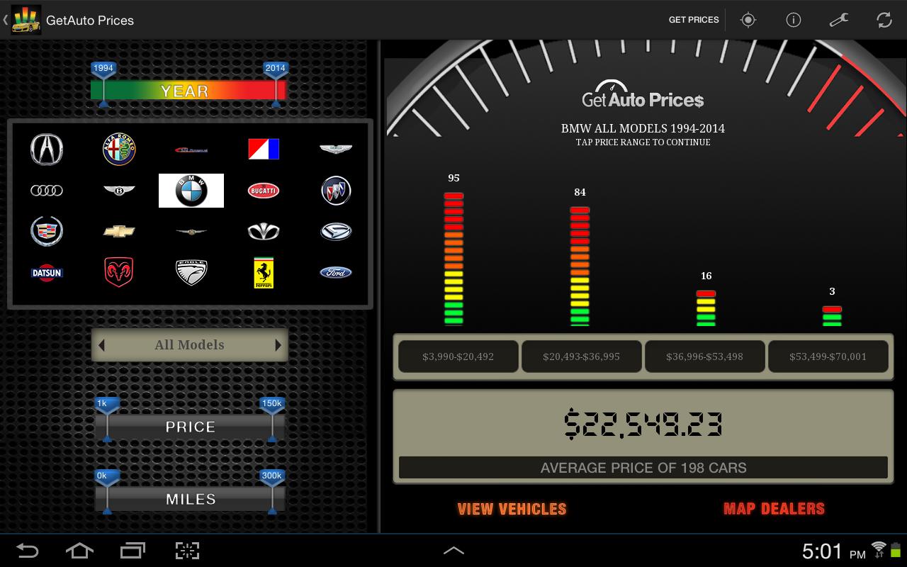 Get Auto Prices puts you in the driver’s seat when shopping for a car with its one of a kind app! With an easy swipe of the screen you can interact with a comparative graph of prices in your market that are updated daily. Armed with that local pricing information you will never pay over market price for the car that you want. And once you find that perfect car at the perfect price, simply email or call the dealer for more information or to schedule a test drive!
