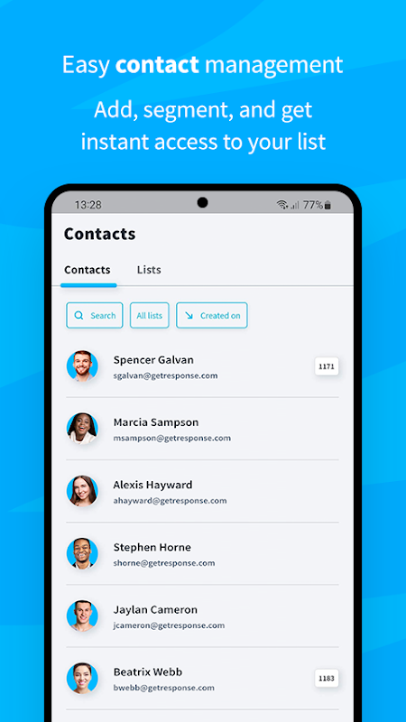 Grazie alla nostra app per dispositivi mobili, avrai sempre a disposizione una fonte inesauribile di informazioni per gestire tutte le attività di online marketing in GetResponse. Consulta dati analitici dettagliati sulle prestazioni delle tue campagne, invia email, raccogli lead, concludi vendite e fai crescere la tua attività, quando vuoi e dove vuoi!