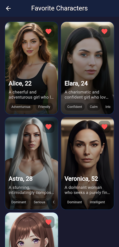 Scegli tra diverse fidanzate AI, ognuna con la propria personalità, tono, storia e stile di conversazione. Alcune sono giocose, altre dominanti, altre dolci o poetiche: ogni personaggio è diverso e si evolve attraverso le tue interazioni.