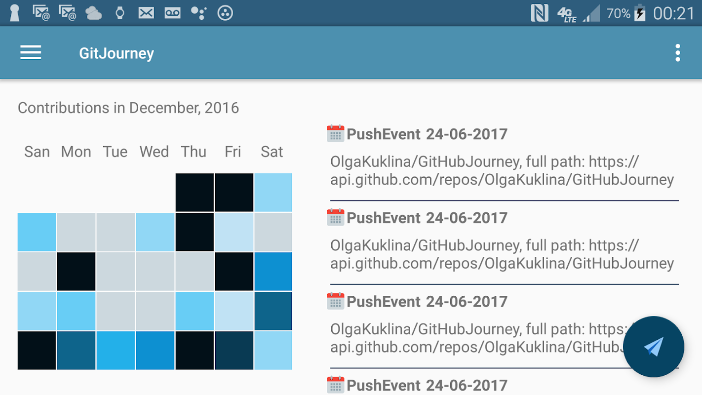 In its main screen you will be able to monitor your daily contribution activity placed in chronological order. Explore your GitHub data such as feed list, repositories, followers list, and starring, watching activity.