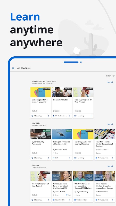 Con Go.Learn, gli studenti possono accedere ai contenuti formativi quando vogliono, e dove vogliono. Puoi visualizzare corsi, piani formativi e condividere contenuti, tenendo traccia dei progressi sia online sia offline. Accedi ai tuoi contenuti utilizzando i canali, oppure carica foto o video dal tuo dispositivo mobile, per condividerli con altre persone all’interno della tua azienda.