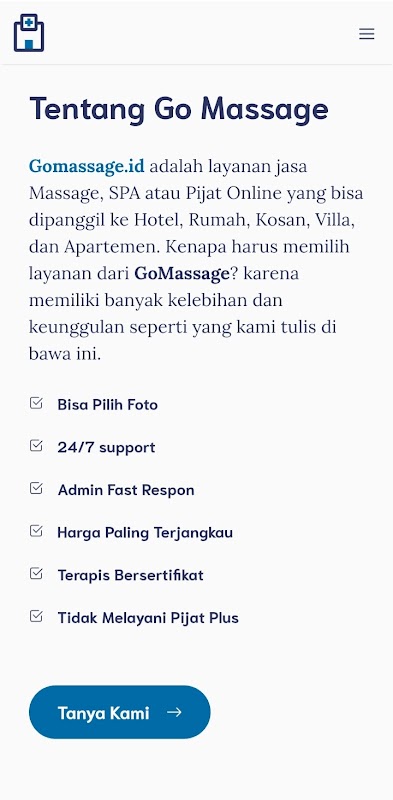 Go Massage è un'applicazione online per massaggi, spa, riflessologia, terapia e massaggi di chiamata per la tua amata famiglia. L'applicazione https://gomassage.id può essere utilizzata in tutte le principali città come: Jakarta, Surabaya, Makassar, Semarang, Solo, Yogyakarta, Bali, Denpasar, Kuta, Balikpapan, Samarinda, Medan, Palembang, Pekanbaru, Bogor, Bandung , Batam e altre grandi città.