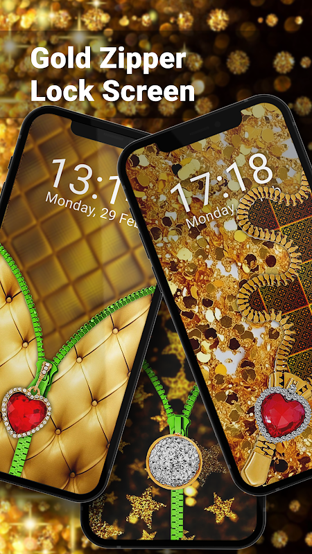 Sperimenta la perfetta combinazione di sicurezza e stile con la nostra schermata di blocco con cerniera dorata. Proteggi il tuo dispositivo con un tocco di glamour, poiché ogni tocco sblocca un regno di possibilità con la nostra straordinaria gamma di temi e sfondi.