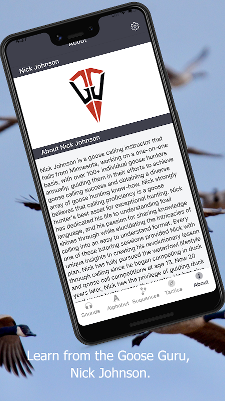 Goose Tech is the cutting edge of goose calling instruction. Under the guidance of the Goose Guru himself, Nick J, you will be able to hone your goose hunting, and, in particular, calling skills and better know how to successfully call in and kill more geese. Goose Tech is designed to take you on a goose calling journey. First, Nick J. covers the basics and introductory concepts. Then he graduates you to the root sounds in goose calls with a specially designed alphabet. Next, you learn a wide variety of goose sounds. Finally, you apply all of this knowledge with various calling sequences and skill builders. You can also record yourself calling and compare to the real sounds on the app. Finally, Nick J has taken his tried and true goose hunting tips and tactics to help you bring it all together.