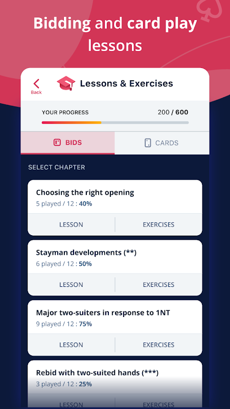 30 lessons on bidding and card play (i.e. the two main phases at bridge) prepared by bridge experts with 400 exercises to put what you learn into practice.