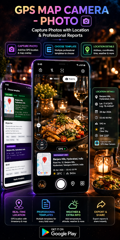 Trasforma il tuo telefono in uno strumento GPS professionale. Aggiungi dati di geolocalizzazione in tempo reale a foto e video, misura con precisione le aree e naviga con una bussola intelligente, tutto in un'unica potente app. 🚀