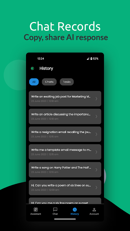 Rimani organizzato e non perdere mai un colpo con la nostra funzione di cronologia integrata. Rivedi facilmente le conversazioni passate e recupera informazioni preziose senza sforzo. La nostra app rende comodo fare riferimento a discussioni precedenti e accedere a dettagli vitali a portata di mano.