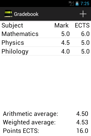 Gradebook - ects for the student or the student. Application designed for the student like a diary, in which the student is part of their assessment of a particular subject and is calculated the average for all subjects and for selected.