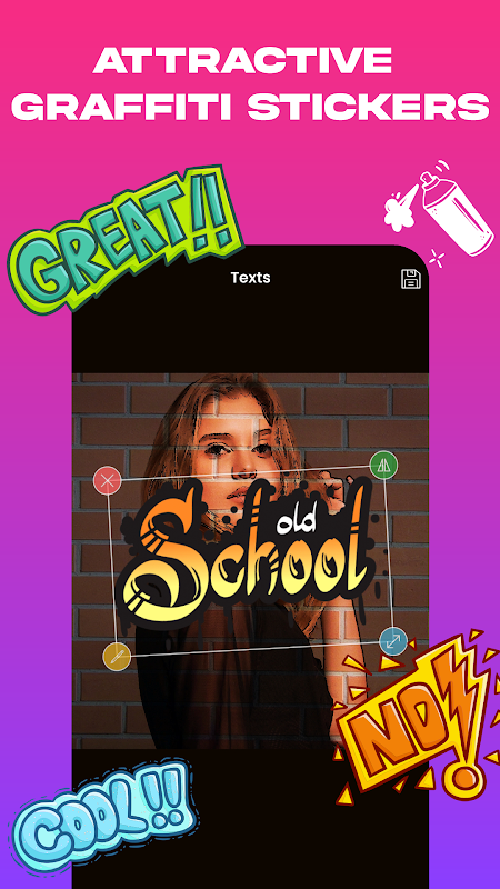 Con Graffiti Art, puoi trasformare qualsiasi immagine in splendidi capolavori di graffiti fotografici. Aggiungi tag per note graffiti, usa strumenti per disegnare nomi, applica effetti in stile graffiti e decora con graffiti paintball e tagga elementi graffiti. Crea il tuo muro di graffiti o scegli un tema graffiti alla moda per personalizzare le tue foto come un vero creatore di graffiti.