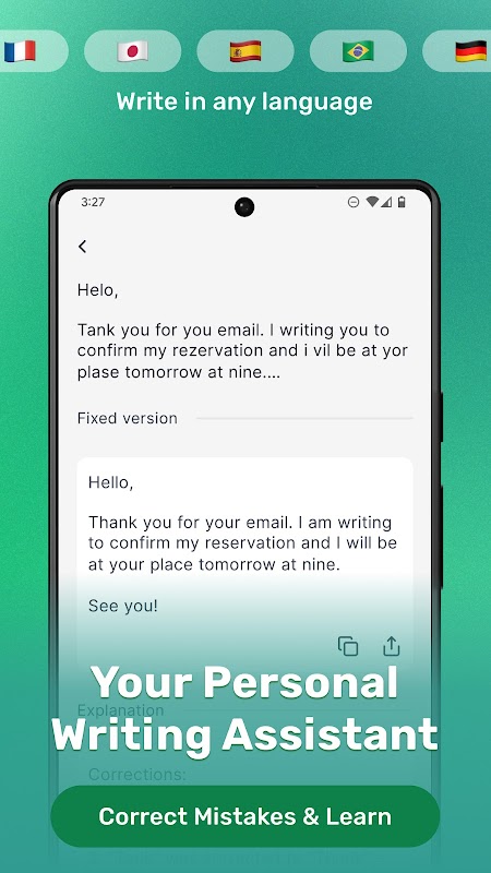 Il tuo viaggio con noi ti offre molto più di un semplice testo grammaticalmente privo di errori; ti fornisce comprensione, conoscenza e uno stile di scrittura migliorato. Diventa un paroliere assoluto e dissolvi ogni apprensione riguardante la tua competenza di scrittura utilizzando l'app "Correzione grammaticale" come assistente di scrittura quotidiano. Di' addio agli errori di sintassi, alle parole errate, alla punteggiatura errata e dai il benvenuto a un testo impeccabile e professionale.