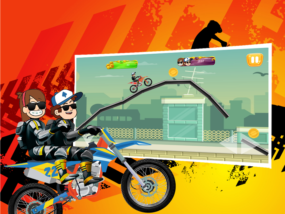the famous hero of gravity fall Dipper and his twin sister Mabel, smart cartoon caracters,they were sent by their parents to gravity fall in Oregon,and they take adventures with motorcycle and unlock levels and motorcycles,