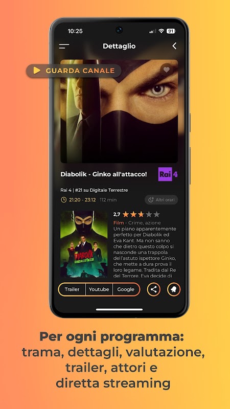 - Dettagli di tutti i Programmi TV con possibilità di vedere il successivo e il precedente,