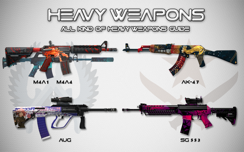 Non dimenticare di pistole. Armi come M4A1-S, M4A4, AK-47, AWP, Scout, Tec-9, USP-S, Glock-18, Deagle, FAMAS, Galil AR, Nova, Negev, MP7, UMP-45, Bizon, P250, SG può essere trovato qui.