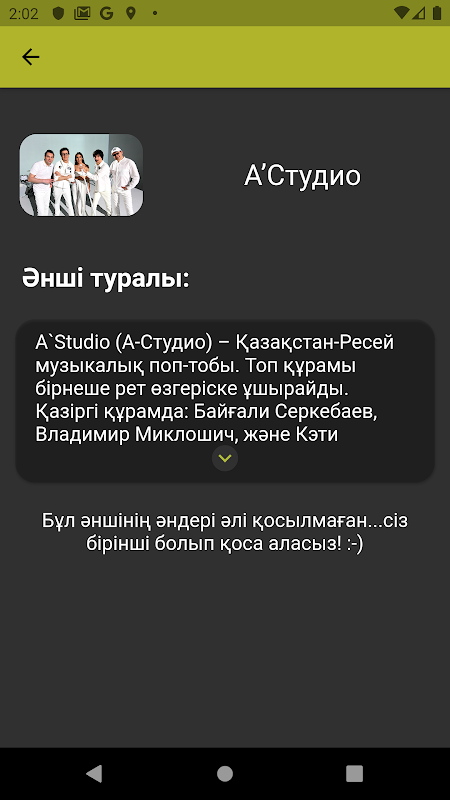 Қосымшаның бұл нұсқауында көптеген өзгерістер еңгізілді: – Қолданушылар ән қоса алады немесе өзі қосқан әндерді өшіру мүмкіндігі бар; – Әндерді іздеу мүмкіндігі қосылды; – Қосымшаға тіркелген қолданушыларды және Әншілерді іздеуге болады; – Ұнаған әндердің жеке тізімі бар;