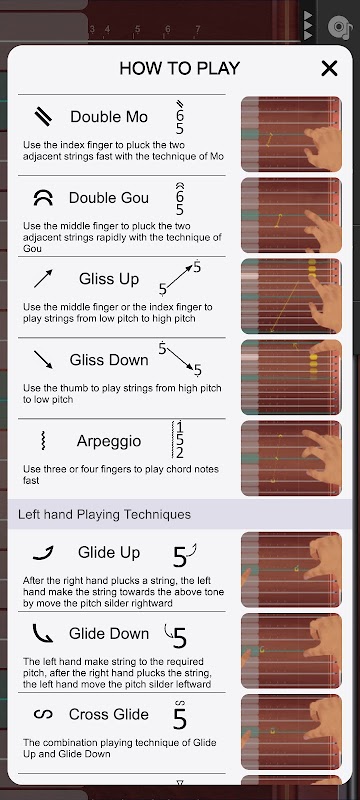 - Tecniche di gioco per la mano sinistra: Pitch slide, Samll-Vibrato, Big-Vibrato, Tap Pitch (Dian Yin - 点音)