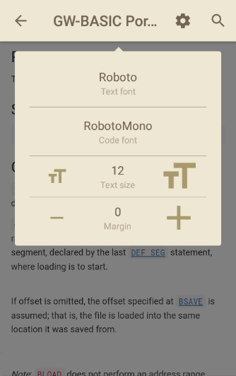 The GW-BASIC Portable Reference offers quick keyword search with autocompletion and adjustable fonts for text and code samples.
