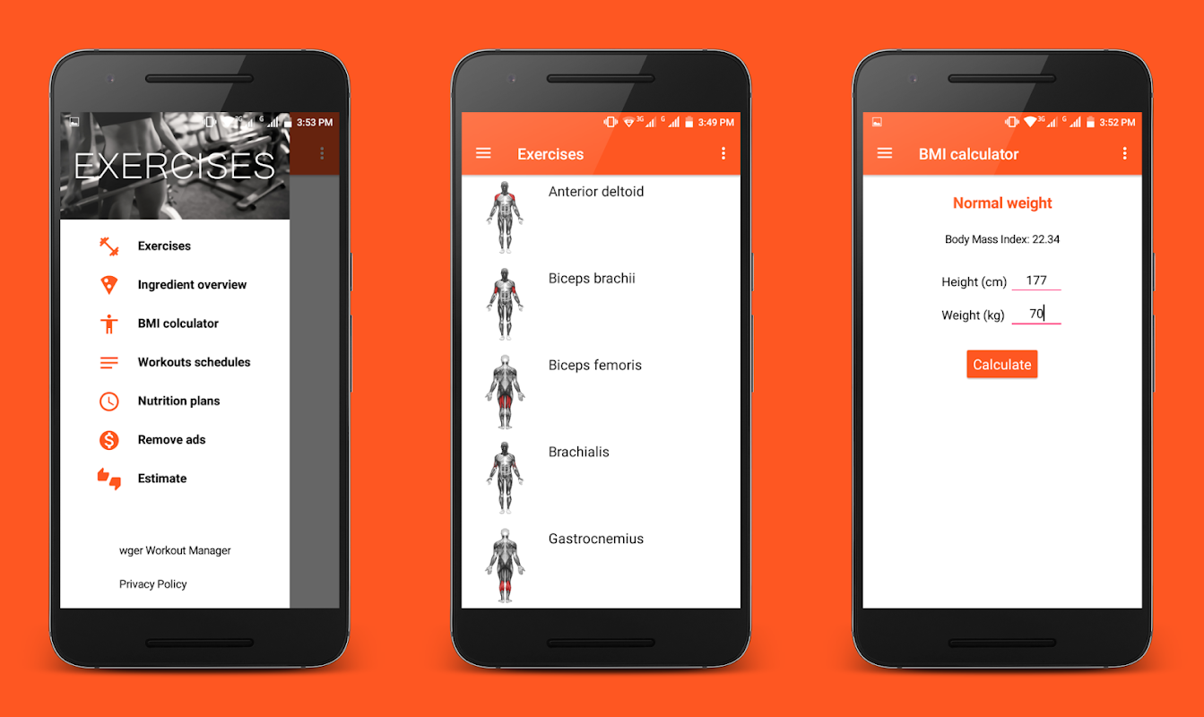All exercises have a detailed description and are tested. In this application, work only three sections: “Exercises list”, “Nutrition” and “Body Mass Index calculator”, in the future, the “Training Diary” and “Nutrition Plan” will be active.