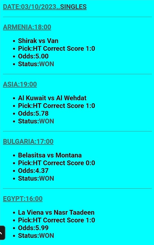 Su questa applicazione ci siamo specializzati quotidianamente sulla certezza dei risultati esatti dell'intervallo. Diamo quattro schedine ciascuna con 5 quote e vi consigliamo di scommettere sulle singole.