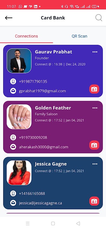 Con la funzione "Card Bank" di HS Cards l'utente può memorizzare i biglietti da visita digitali della propria connessione in modo sistematico, inoltre l'utente può scansionare le carte fisiche e conservarle nella banca delle carte. La parte migliore della banca dati è che non utilizza la memoria del telefono per archiviare le carte; invece tutto l'archiviazione avviene su cloud senza sovraccaricare l'applicazione sulla memoria del telefono.