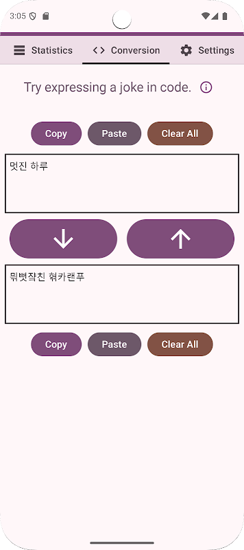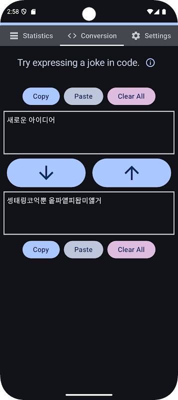 La terza scheda di questo gioco fornisce una funzione di conversione. Il principio di conversione segue la stessa logica della meccanica principale del gioco. Supporta sia la conversione diretta che quella inversa. Utilizzando questa funzione, puoi crittografare il testo coreano in modo semplice. Scambiare questi semplici messaggi crittografati con gli amici può aggiungere un po' di divertimento alla tua vita quotidiana.