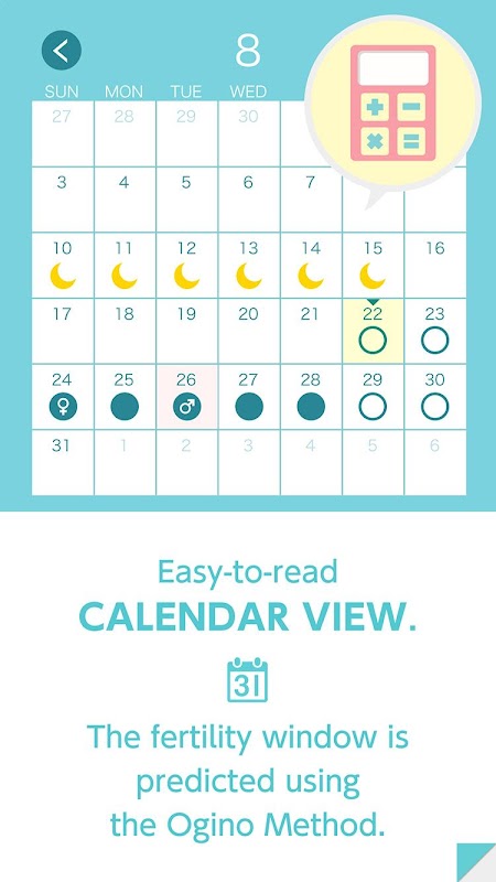L'app utilizza il metodo di calcolo Ogino per calcolare i giorni con alte probabilità di ottenere una gravidanza. I risultati del metodo non sono certi, pertanto si prega di considerarli solo come una stima approssimativa.