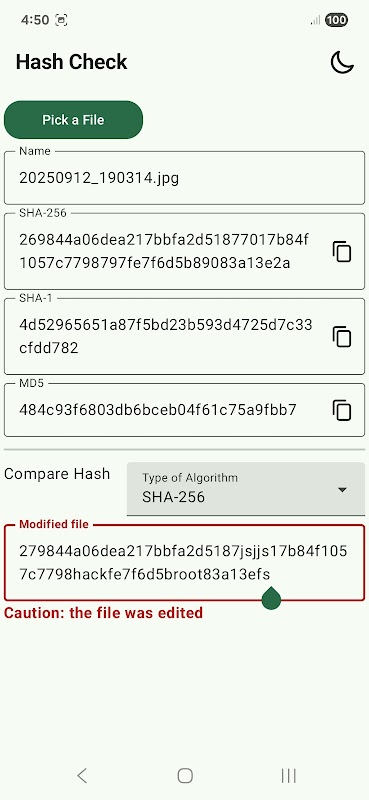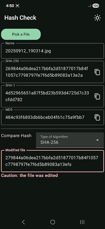 - Verifica file: seleziona qualsiasi documento, immagine, eseguibile, APK, ecc. e ottieni immediatamente il suo hash SHA-256.