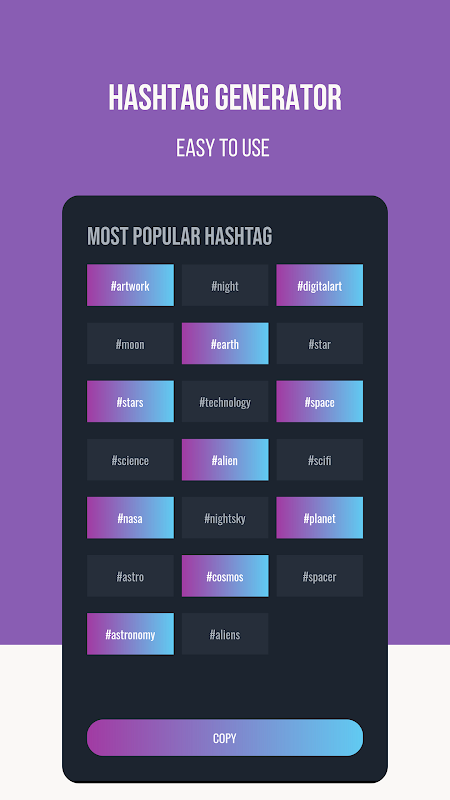 Basta digitare una parola e il resto del lavoro verrà svolto dall'applicazione. Abbiamo mantenuto l'interfaccia utente futuristica e facile da usare. Puoi generare molti hashtag attraverso la nostra applicazione e posizionarli su più social media che ti aiuterebbero a ricevere più portata e coinvolgimento