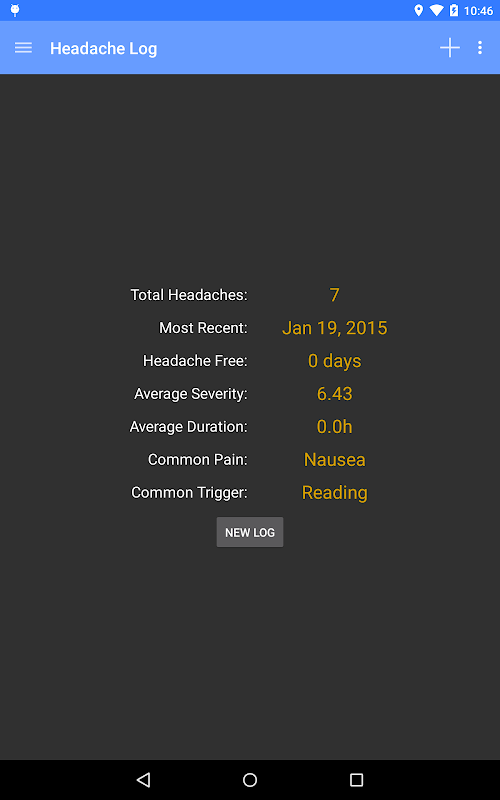 • Visualizzare una serie di statistiche circa il mal di testa come il numero di mal di testa sono stati registrati, il numero di giorni dopo il mal di testa, la gravità media, la durata media, dolori più comuni, posizioni e farmaci