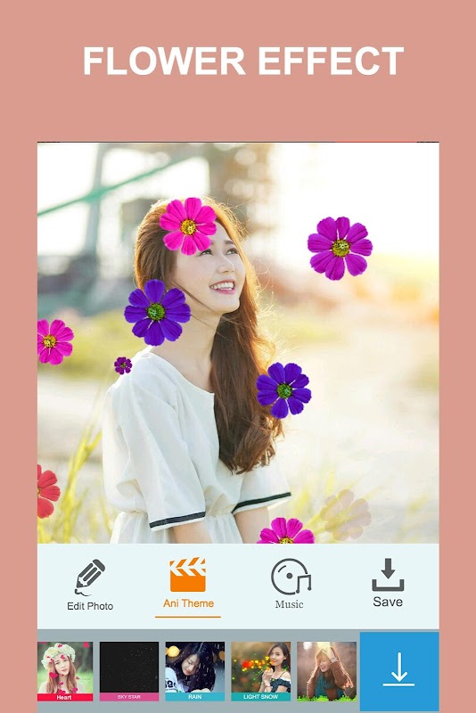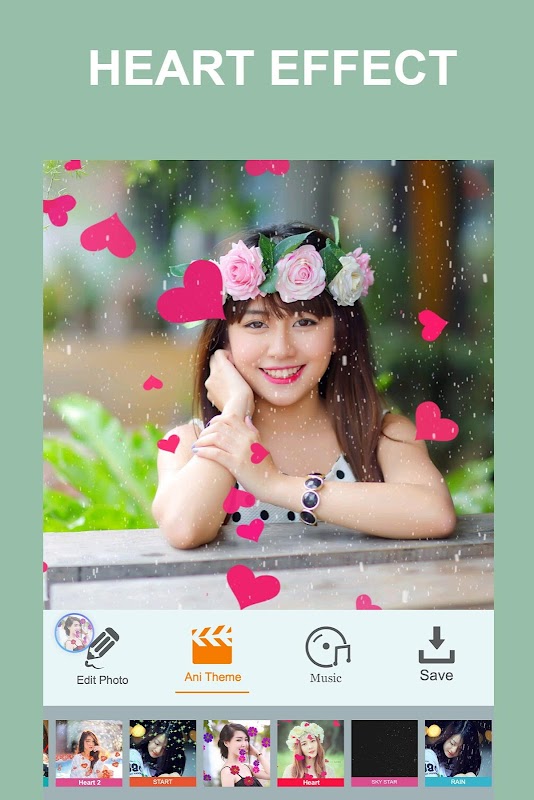 + Select effect animation you love: Loves Effect video, Heart Effect Video, Light Effect Video, Bubble Effect, Rain Effect, Snow Effect and so on....
