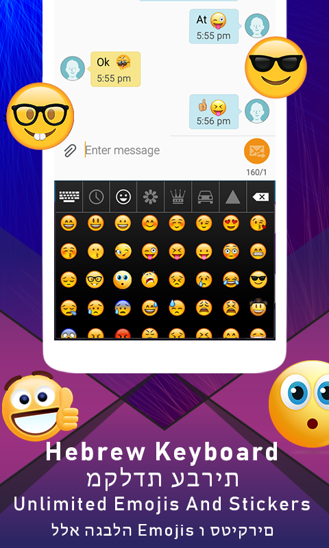 La tastiera inglese ebraica è il modo per utilizzare la tastiera mobile predefinita con tastiera ebraica, gif, tastiera emoji per dispositivi mobili. La tastiera ebraica è probabilmente compatibile con la tastiera multilingue e l'app di digitazione ebraica con adesivi eleganti. Tastiera dall'ebraico all'inglese per cambiare il tuo telefono in un modo.