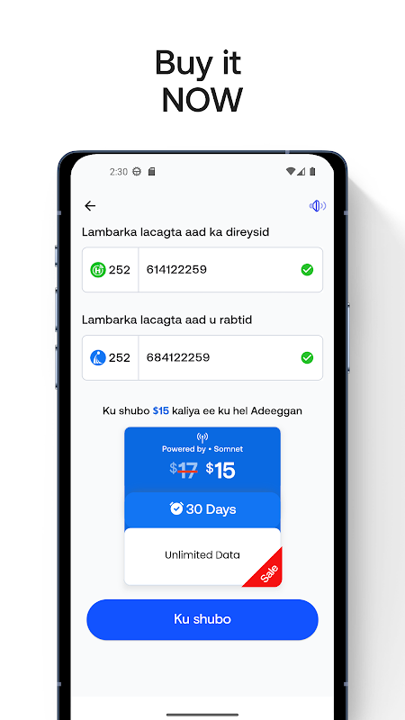 Ottieni facilmente dati SIM da Hormuud, Somnet, Amtel e Somtel.